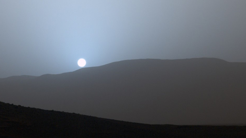 Ярко-голубой закат можно наблюдать и на Марсе. Атмосфера здесь менее плотная, зато содержит огромное количество частиц пыли. Днем они поглощают коротковолновую часть спектра, остаются видимыми лишь длинноволновые оттенки, поэтому эту планету и называют «красной». Но когда наступает марсианский вечер, отчетливо проявляется голубое сияние.